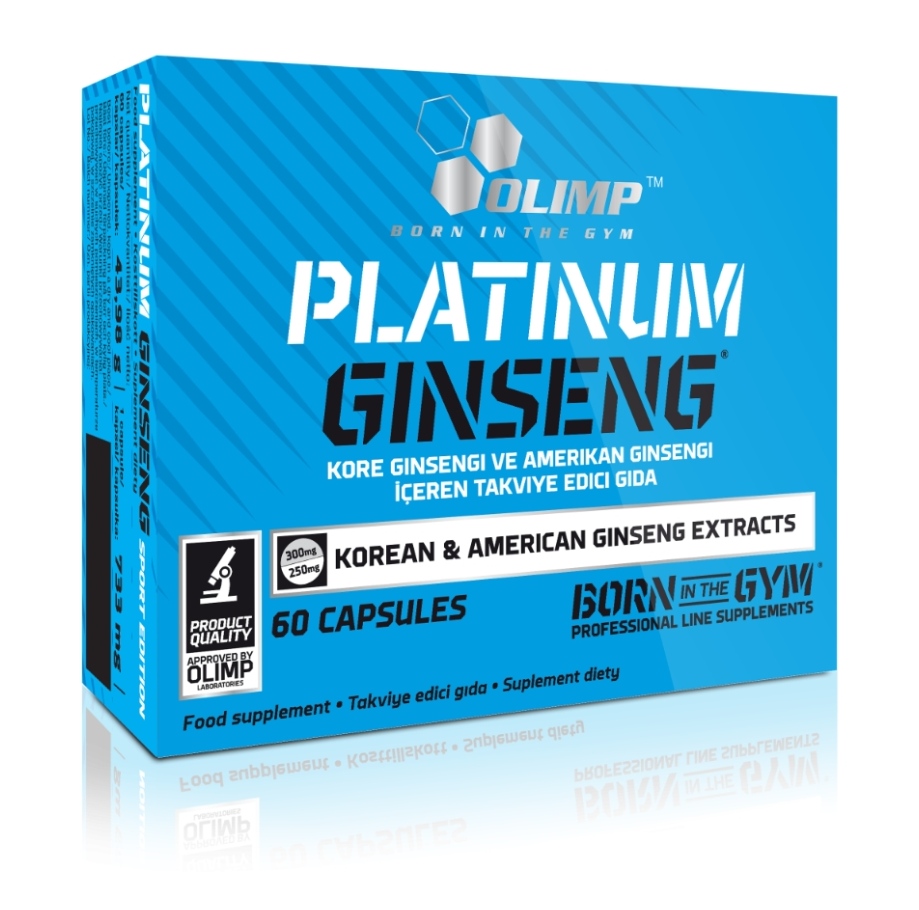 Olimp Platinum Ginseng, Kore Ginseng'i ile Amerikan Ginseng'i ekstrelerini bir arada sunan sporculara yönelik geliştirilmiş bir üründür. Ginsengin etken maddesi olan ginesioidleri standardize edilmiştir. Bu sayede her kapsülde eşit miktarda etken madde sunmaktadır. Olimp Platinum Ginseng formülünü arpa ekstresi ile tamamlamıştır.